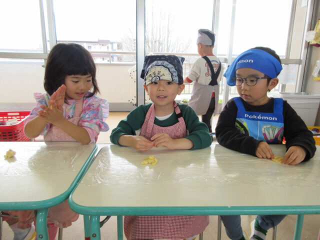 待ちに待ったお菓子作り。「今日はエプロン持ってきたよ!お菓子いっぱい作れるかな?」と子どもたちは朝から大騒ぎ!!