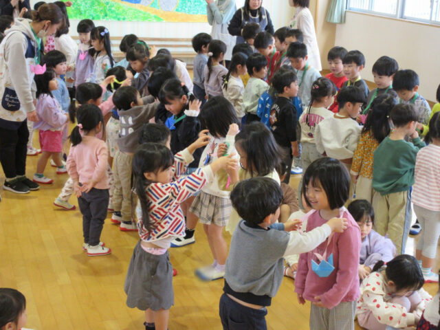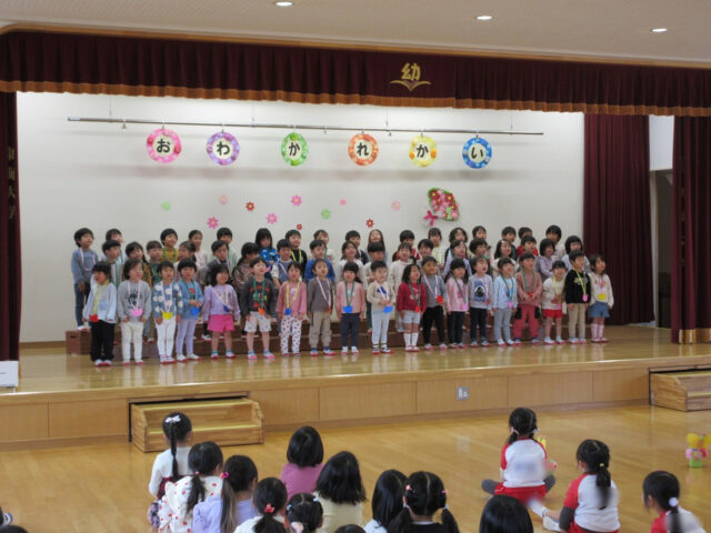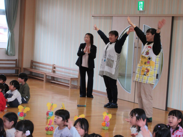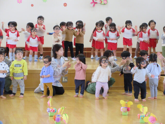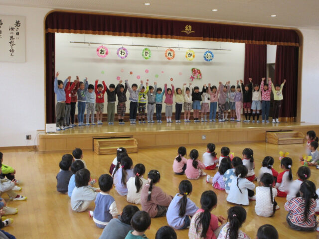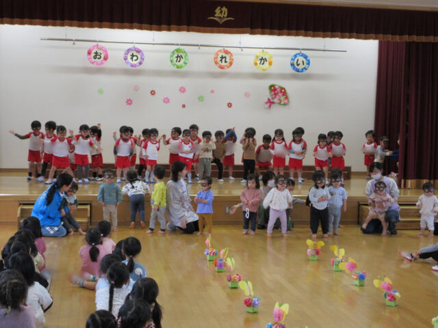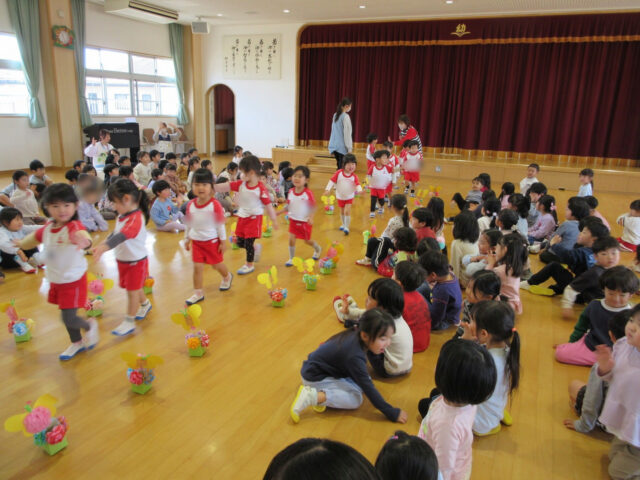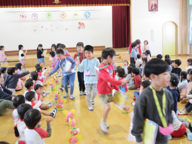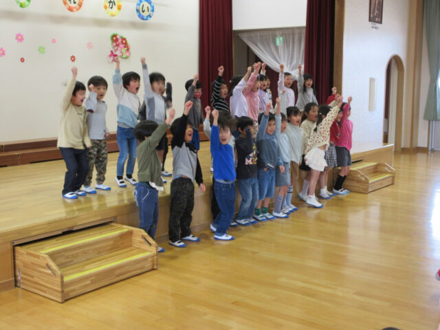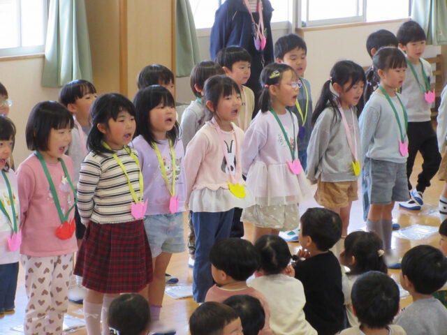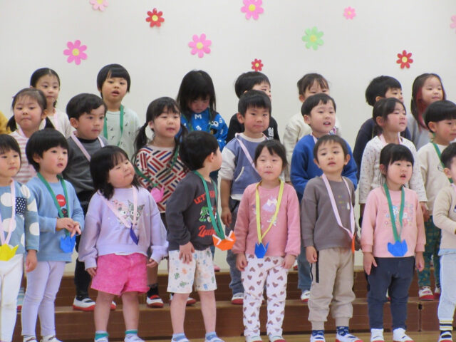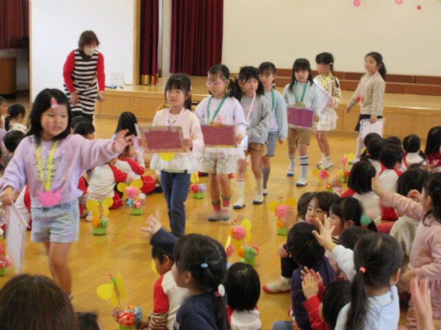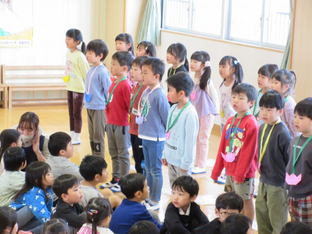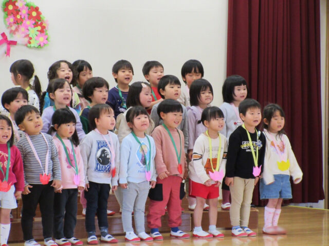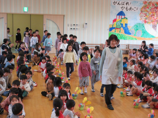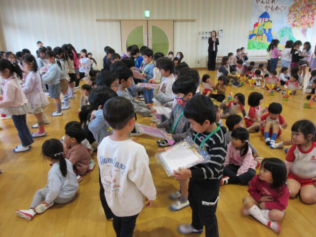 「みなさん今日は、年長さんにステキなプレゼントをありがとうございました。4月から年長さんは1年生、そしてみなさんたちも1つおおきくなりますよ。*ありがとう*の言葉と気持ちを大事にしてくださいね」