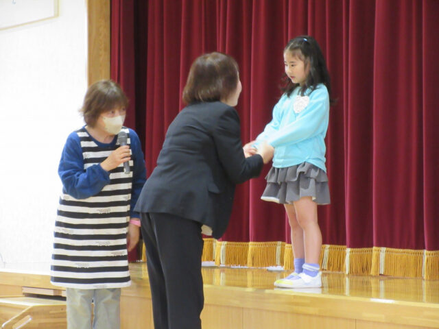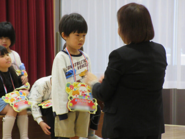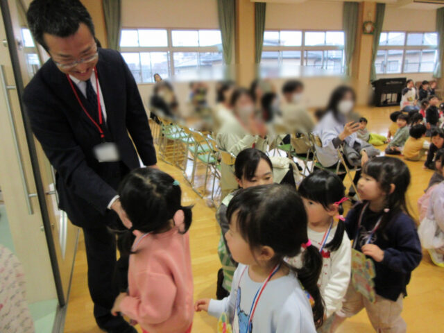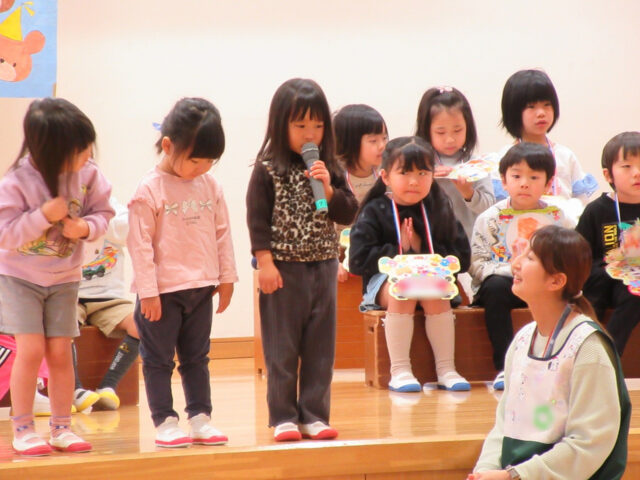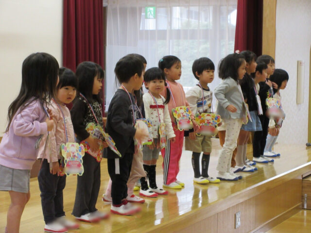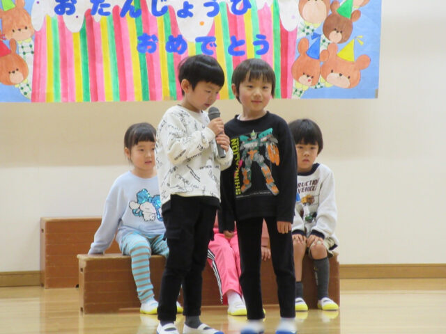 今日は誕生会の前に、今月の10日で幼稚園とお別れをするお友達の紹介をしました。