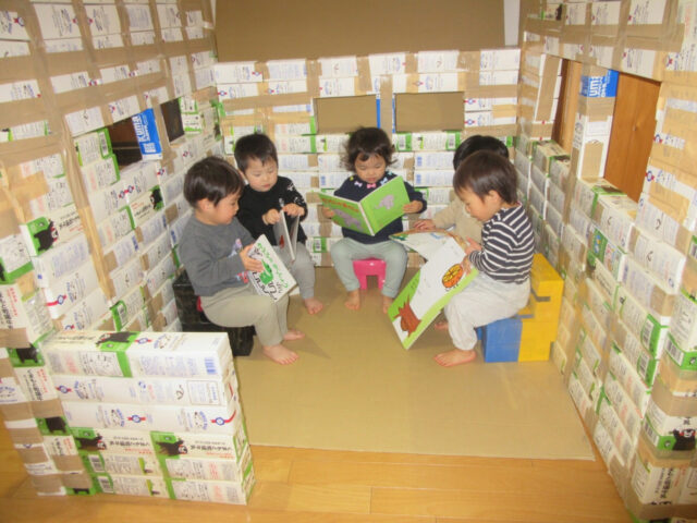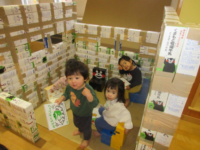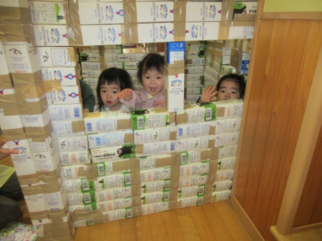 一年間子ども達が飲んだ牛乳のパックがたくさんあったので、せっせと積み上げて牛乳パックハウスを作ってみました!