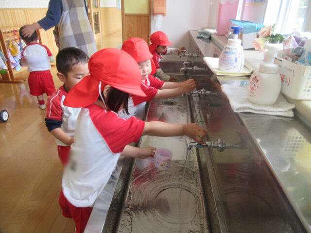 お外で遊んだ後の手洗いうがいも上手になってきたかしら・・・。油断したら水遊びになっていることもありますが・・・。