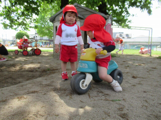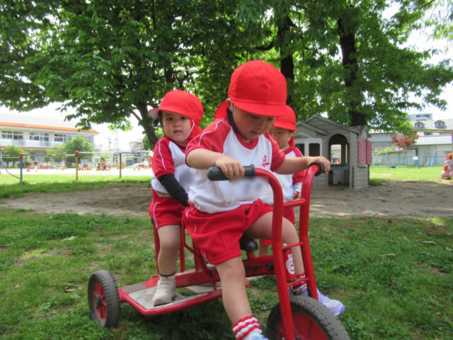 大きな三輪車は、興味があるものの、まだこぐことが難しい様子。それでも乗って満足のいちご組さんです。